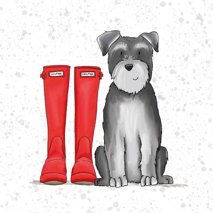 Here is a card from my “Walkies” range. This one features a Schnauzer dog sitting next to a pair of red wellies. As there are no words on the front, it can be used for a number of occasions.